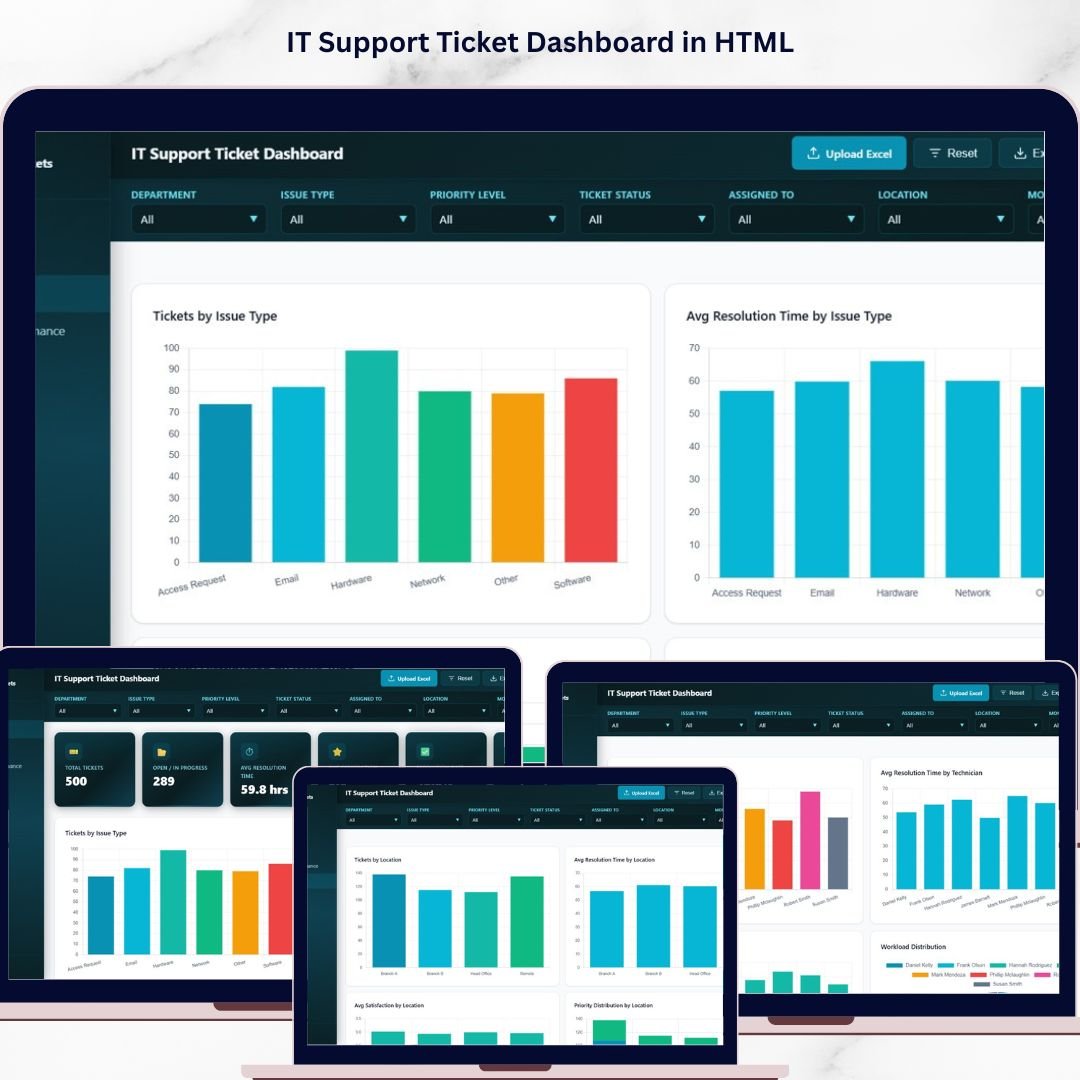 IT Support Ticket Dashboard in HTML is a professional, browser-based analytics template built for IT managers, help desk supervisors, service desk analysts, and technology leaders who want to monitor support ticket volume, resolution times, technician performance, and customer satisfaction from a single interactive interface. This dashboard transforms raw IT support data into actionable visual insights without requiring any software installation 🚀. Simply open the HTML file in Chrome, Firefox, or Edge and start exploring your IT support metrics instantly.