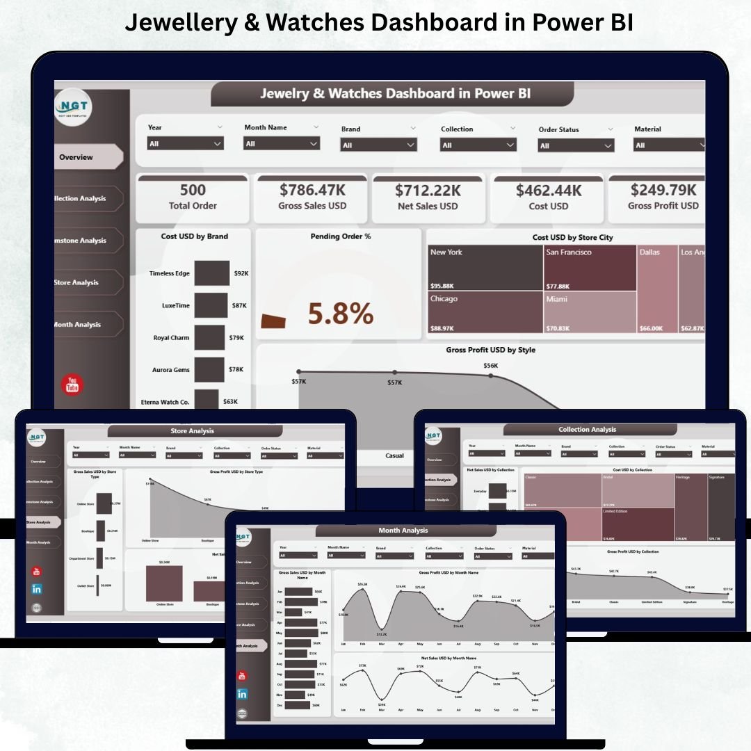 The Jewellery & Watches Dashboard in Power BI transforms complex retail reporting into clean, meaningful insights. Whether you want to analyze gemstones, collections, stores, brands, or monthly trends, this dashboard gives precise and powerful information. When used consistently, it helps brands improve sales, control cost, optimize inventory, and build a more profitable business.