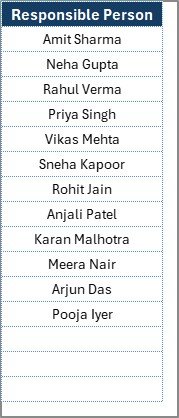 Stores the master list of responsible persons used for dropdown selections, ensuring consistent data entry and reducing errors.