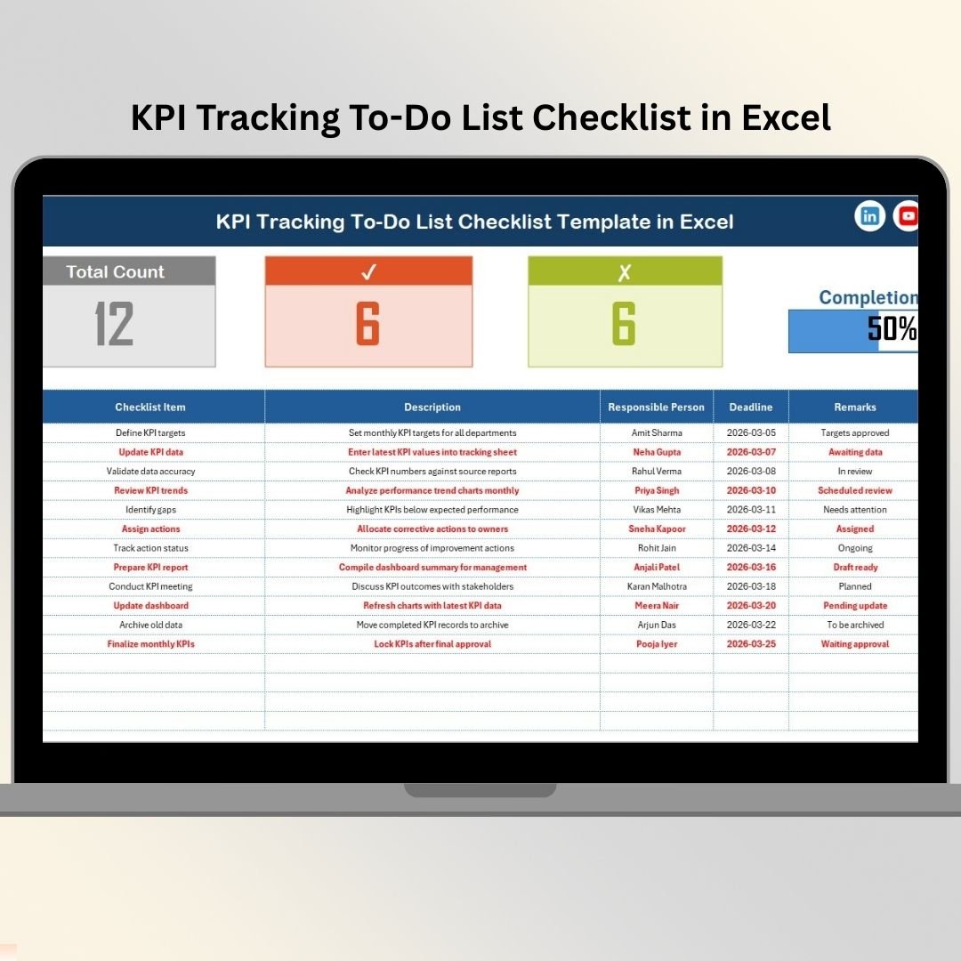 KPI Tracking To-Do List Checklist in Excel The KPI Tracking To-Do List Checklist in Excel is a ready-to-use task management template designed to organize KPI activities, track progress, assign responsibilities, and monitor completion status through a simple yet powerful checklist system. Instead of managing tasks across multiple tools, teams can control everything within one centralized Excel sheet.