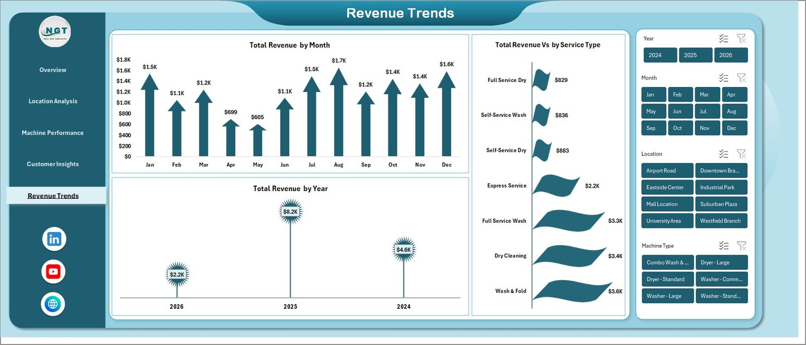 Running a successful laundromat business means juggling revenue across multiple locations, machine uptime, customer satisfaction, staff costs and service mix — all at once. The Laundromat Dashboard in Excel pulls every one of those moving parts into a single, visual command centre so you can see exactly how your coin-op or card-operated laundry is performing and where the next revenue opportunity is hiding. Whether you run a single neighbourhood store or a multi-location self-service chain, this Excel dashboard template gives you data-driven clarity in minutes instead of hours.