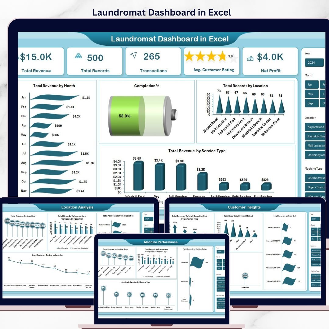 The Laundromat Dashboard in Excel is a ready-made Excel template that tracks 5 KPIs and 15+ charts across 5 analysis pages, helping laundromat owners monitor revenue, machine performance, customer ratings and location profitability in one workbook.