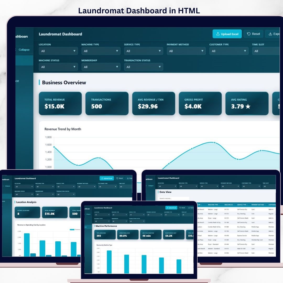 This HTML Laundromat Dashboard Template is engineered for laundromat owners, multi-store operators, franchisees and facility managers who want a single browser-based command centre for every coin-op or card-operated laundry location they run. Because it is built in pure HTML, CSS and JavaScript, the dashboard works instantly on any laptop, desktop or tablet — no Microsoft Excel, Power BI licence or SaaS subscription required.