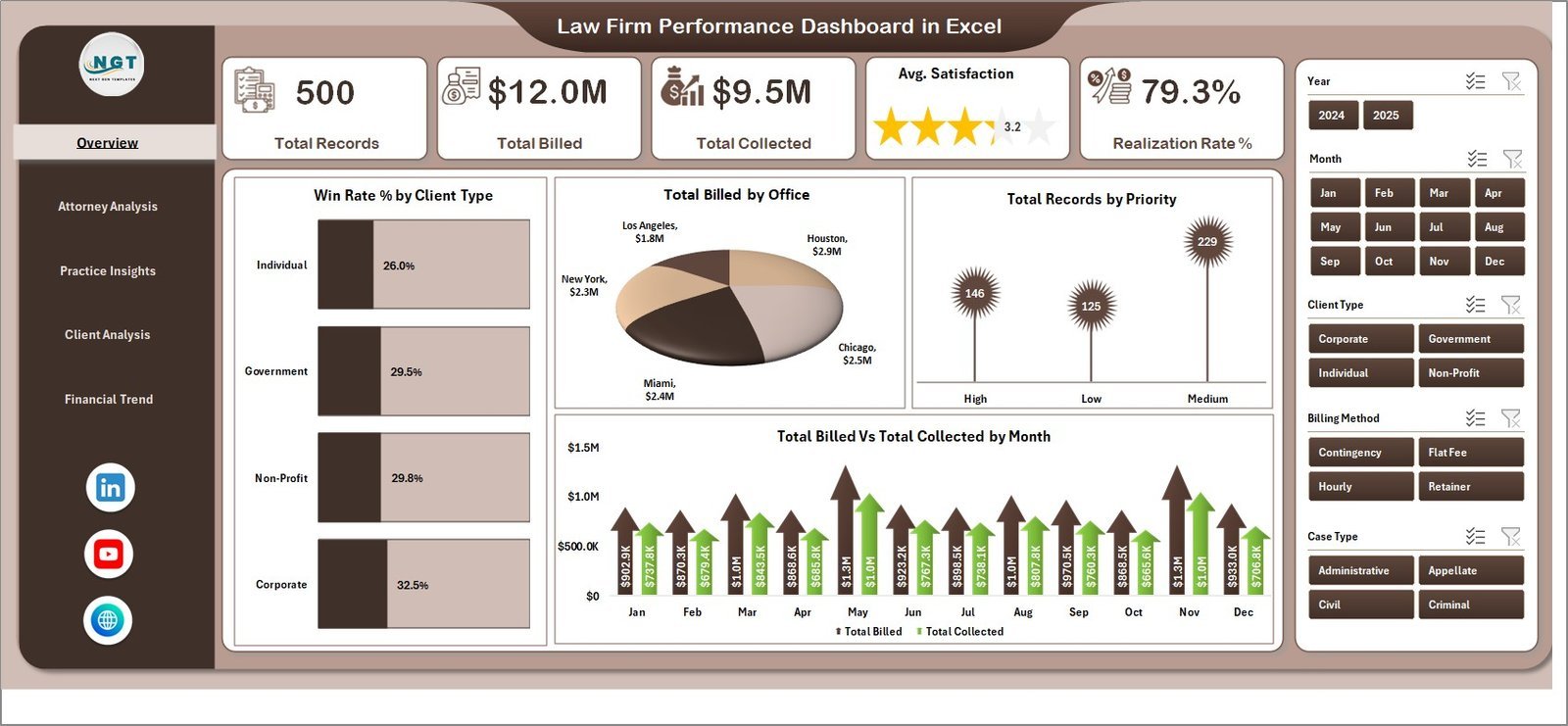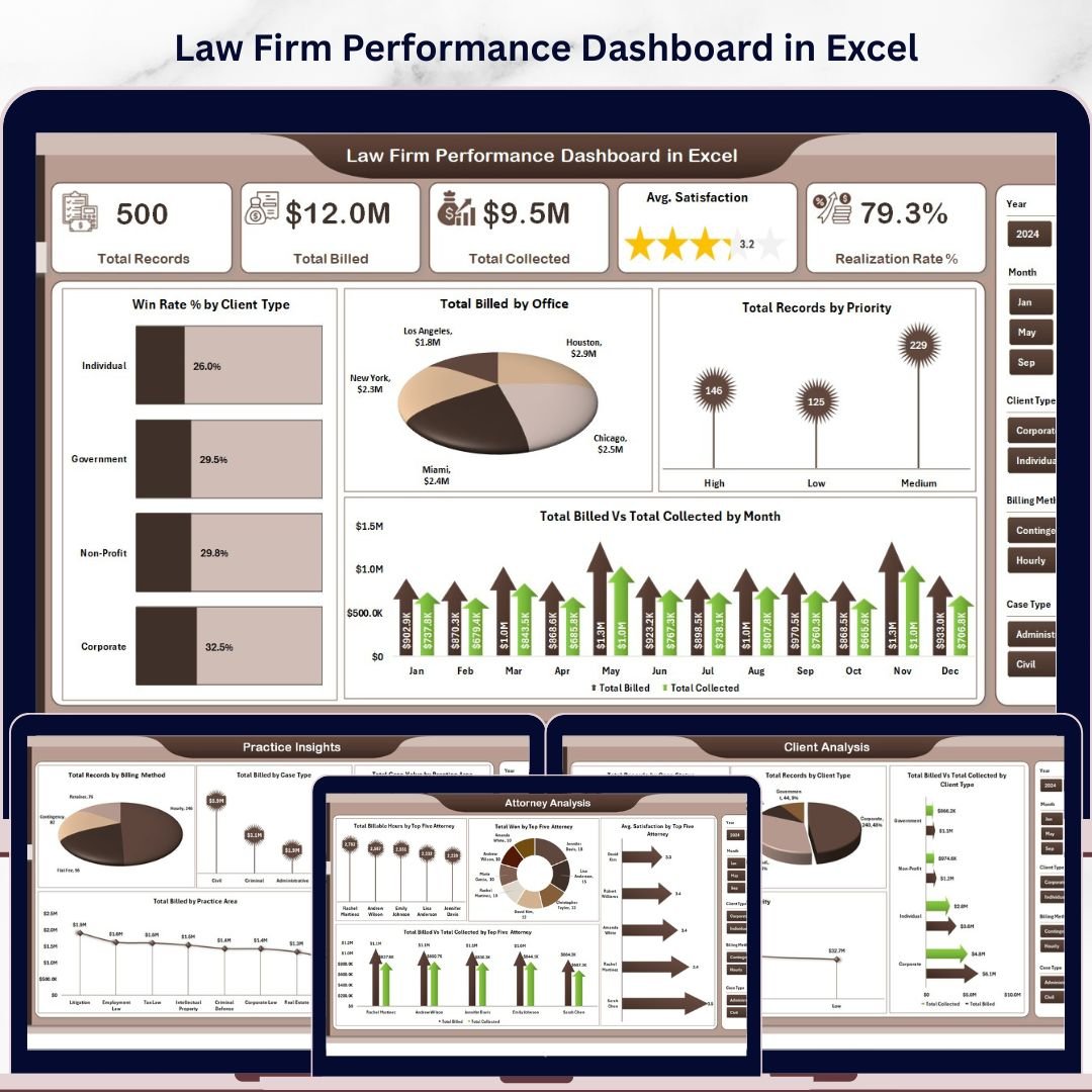Law Firm Performance Dashboard in Excel is a comprehensive analytics template designed specifically for law firms, legal departments, and solo practitioners who need to track billing, collections, client satisfaction, and attorney performance in one centralized Excel workbook. This dashboard includes 5 interactive pages — Overview, Attorney Analysis, Practice Insights, Client Analysis, and Financial Trend — covering every critical aspect of law firm operations. It tracks key metrics including Total Records, Total Billed, Total Collected, Average Satisfaction Score, and Realization Rate percentage. Built entirely with Excel pivot tables and slicers, every chart refreshes automatically when you update the data sheet.