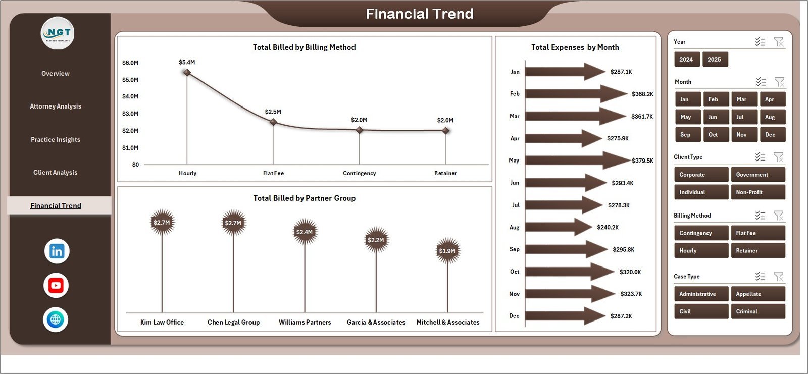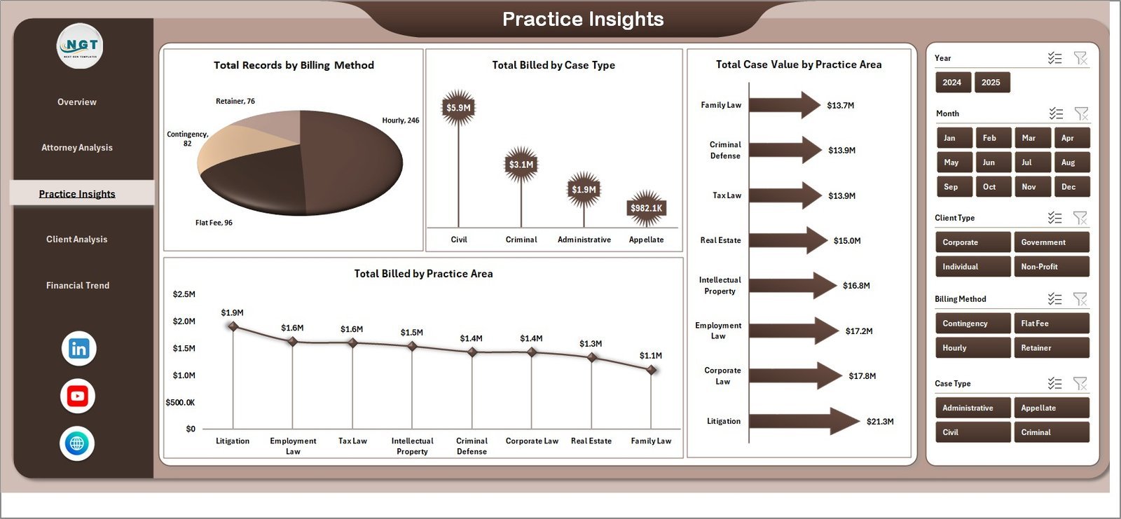 5️⃣ Review each analysis page — Attorney Analysis, Practice Insights, Client Analysis, and Financial Trend — for detailed breakdowns.