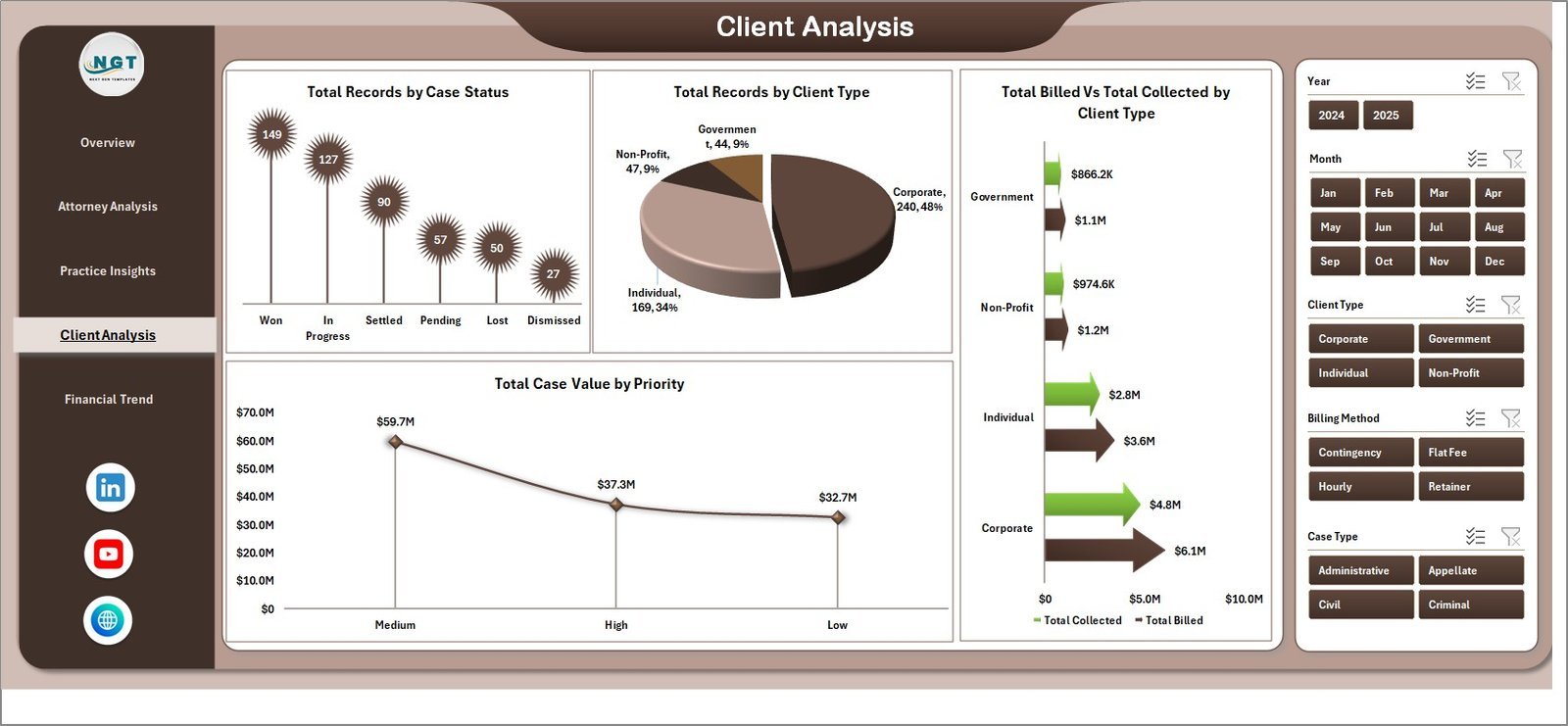📌 Client Analysis Page — Understand your client base with Total Records by Case Status, Total Records by Client Type, Total Billed vs Total Collected by Client Type, and Total Case Value by Priority. Track which client segments drive the highest billing volume.