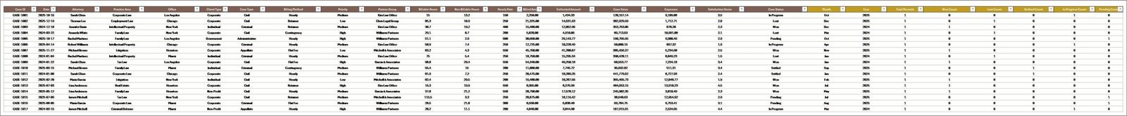 2️⃣ Navigate to the Data Sheet tab and replace the sample data with your own law firm case records in the same column format.