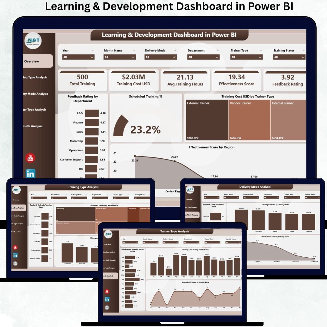 The Learning & Development Dashboard in Power BI is a ready-to-use analytics solution that converts raw training data into clear, interactive, and decision-ready insights. Instead of manually consolidating reports, HR leaders can instantly track training performance, trainer effectiveness, training cost, delivery mode impact, feedback ratings, and overall learning effectiveness—all in one dashboard.