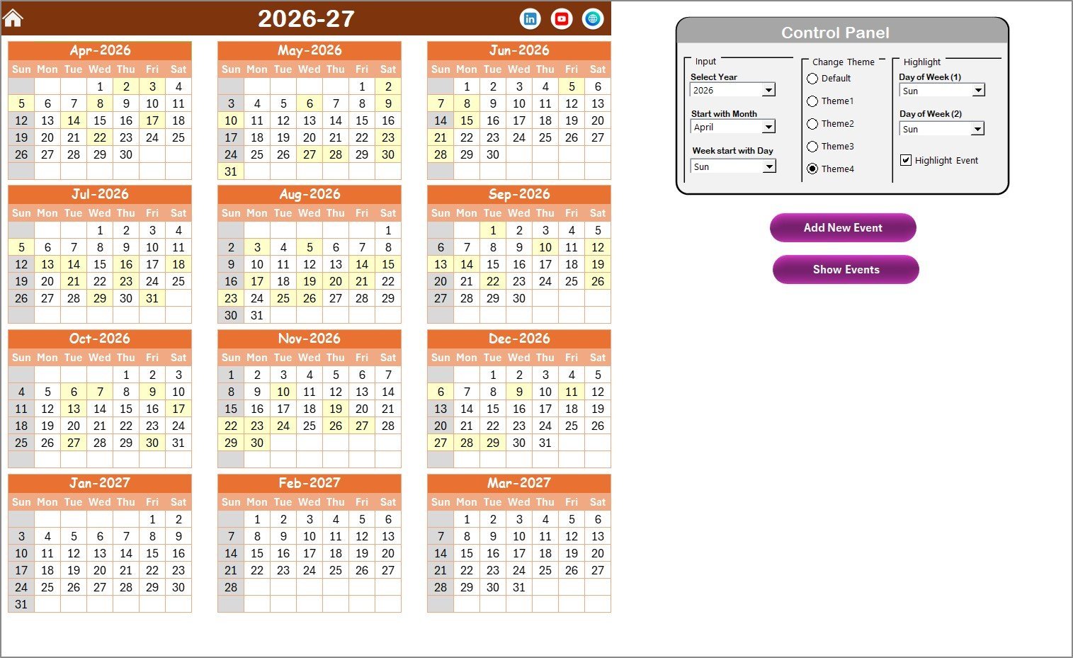 On the Annual View Sheet, you can see all 12 months at a glance. Customize the calendar by selecting the year, starting month, and even the starting day of the week. Choose from 5 beautiful color themes to personalize your calendar’s look and highlight important days such as weekends or special events. Use the control panel to add new events or view existing ones quickly.