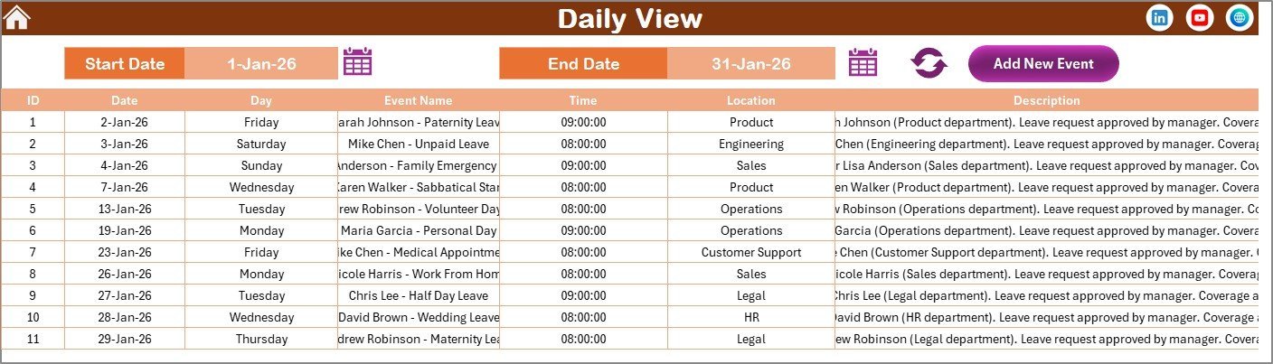 Use the Monthly View to focus on one month at a time, ideal for detailed planning. The Daily View lets you filter events by date range for a comprehensive overview. The Events Sheet provides full control over your event records with options to add, update, or delete entries.