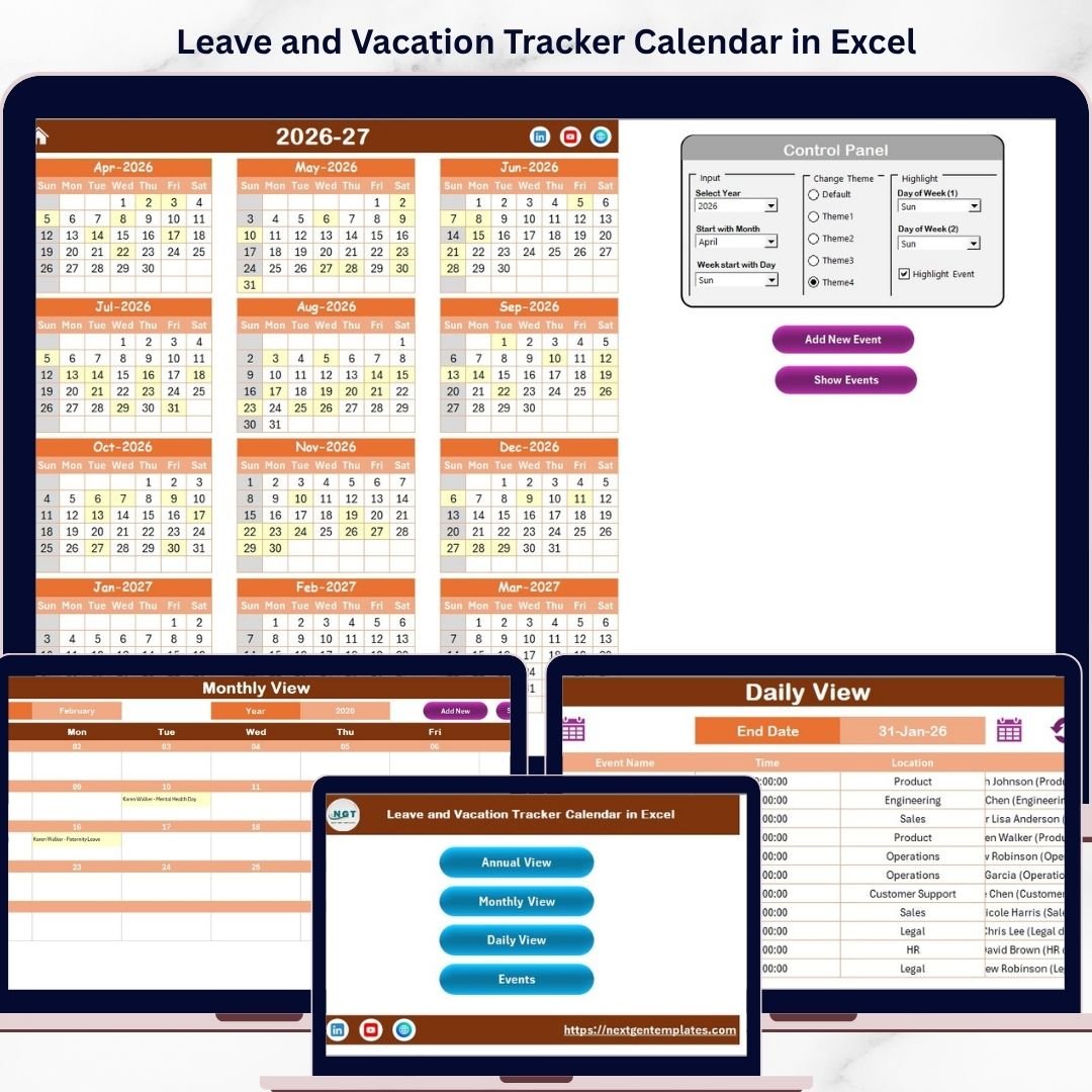 Manage your leave and vacation schedules effortlessly with our Leave and Vacation Tracker Calendar in Excel! This ready-to-use Excel template is designed to simplify tracking leaves, vacations, and events for individuals and teams alike. The calendar features five dynamic worksheets that offer multiple views to suit your preferences: Annual, Monthly, Daily, and an Events database. Navigate easily using the Home sheet’s intuitive button interface.