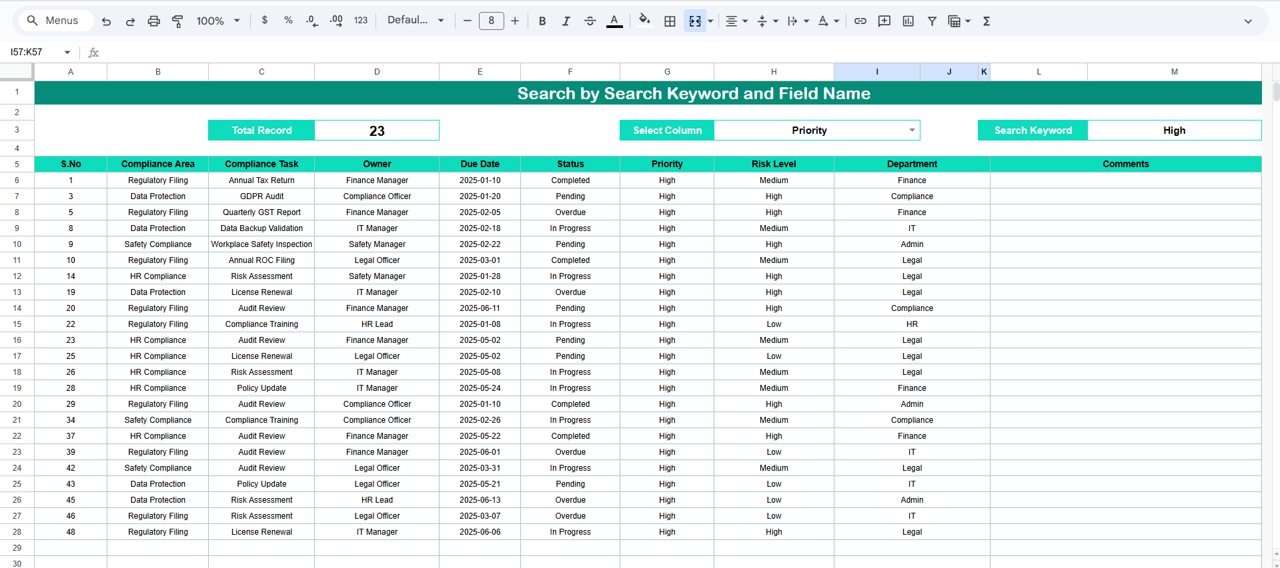 This ready-to-use cloud-based tracker helps you record, monitor, and analyze all compliance tasks in one centralized location. It ensures teams stay aligned, high-risk tasks are addressed early, and compliance performance is always visible. Whether your organization handles regulatory inspections, HR audits, safety checks, financial compliance, or operational controls, this tracker gives you complete clarity and confidence.Legal Compliance Tracker in Google Sheets