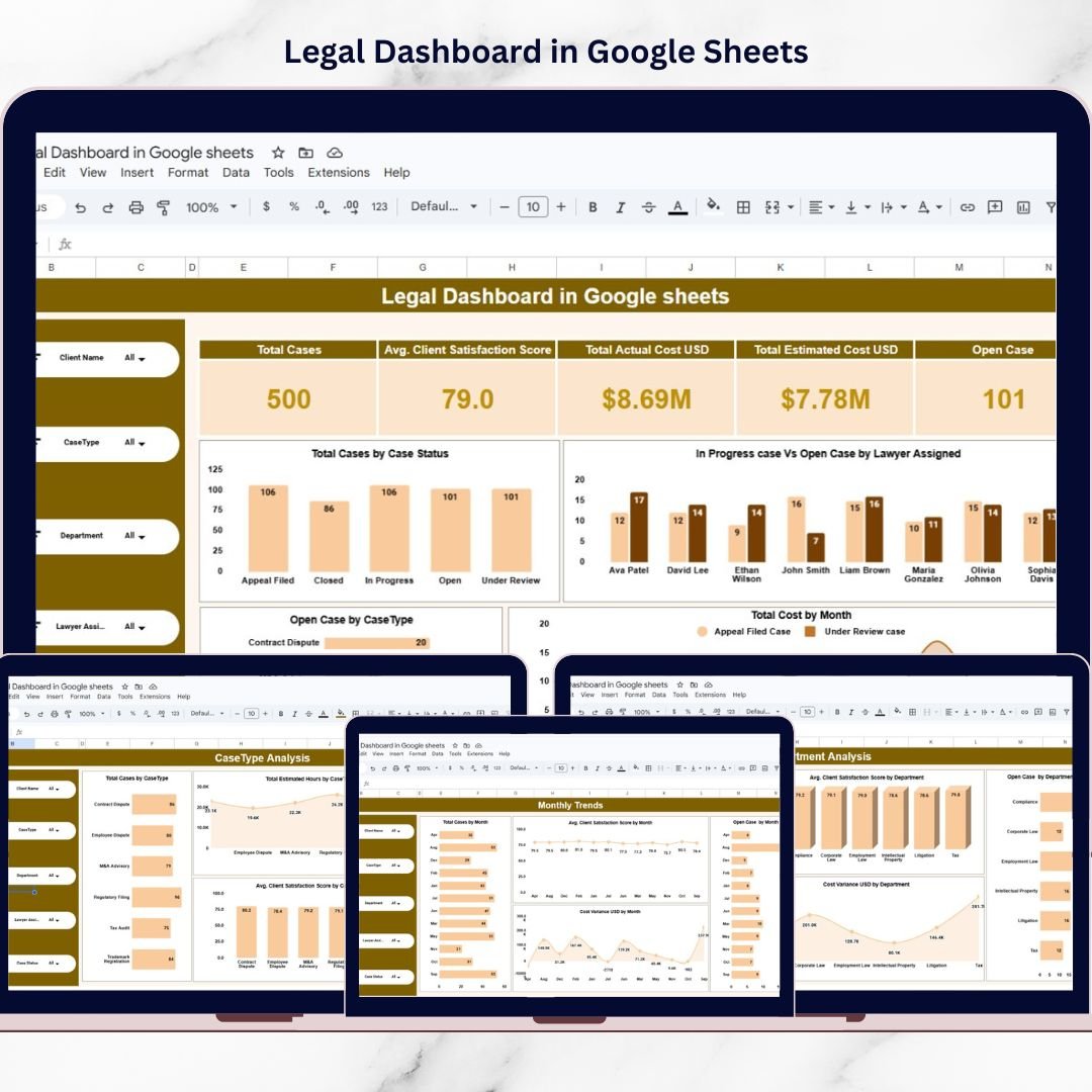The Legal Dashboard in Google Sheets is a professionally designed, ready-to-use analytics tool that helps legal teams monitor case performance, track legal costs, analyze lawyer workload, and evaluate client satisfaction in one centralized dashboard. Instead of reviewing scattered spreadsheets or disconnected reports, managers can view all important legal metrics in one place.