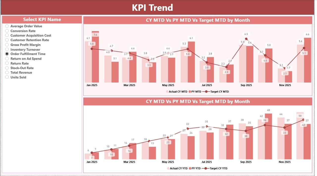 📉 KPI Trend Analysis Page – Deep-dive into individual KPIs with combo charts for MTD and YTD trends.
