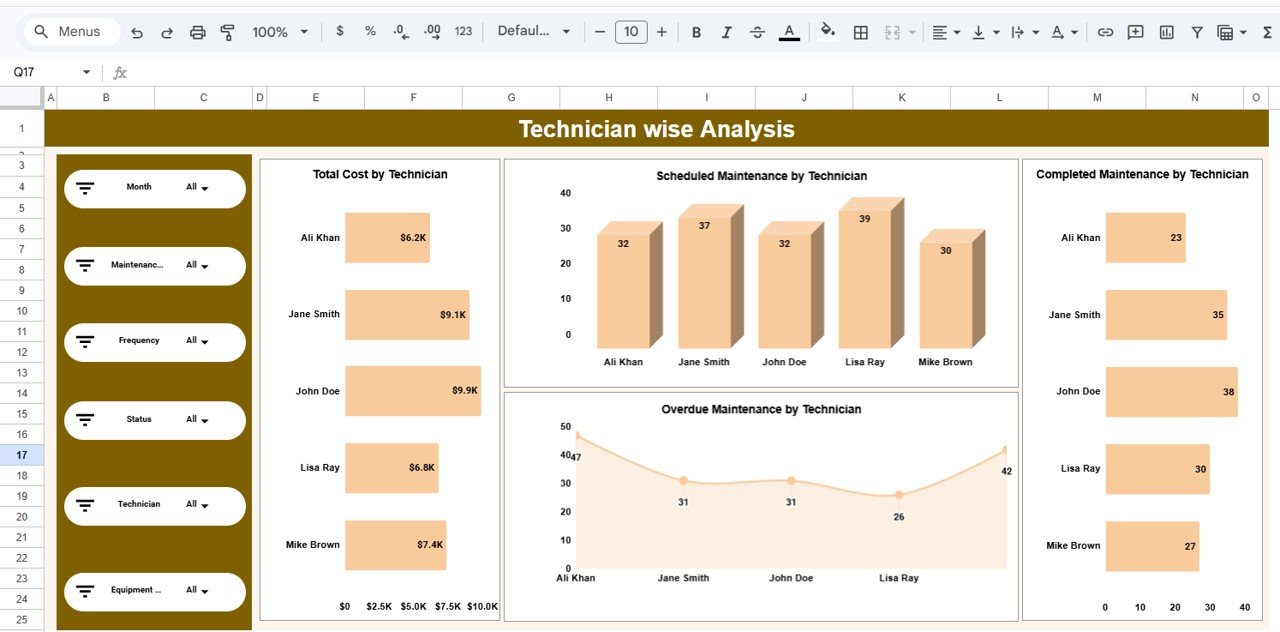 Interactive Filter Panel – Instantly slice data by Month, Maintenance Type, Frequency, Status, Technician, and Equipment.