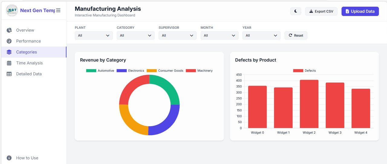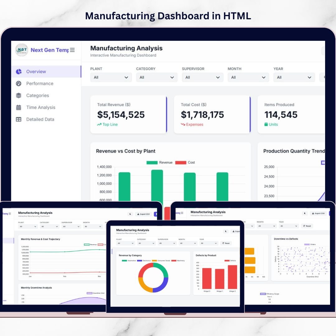 Instead of relying on scattered spreadsheets and manual reports, the Manufacturing Dashboard in HTML provides a centralized analytics platform that improves operational visibility and productivity.
