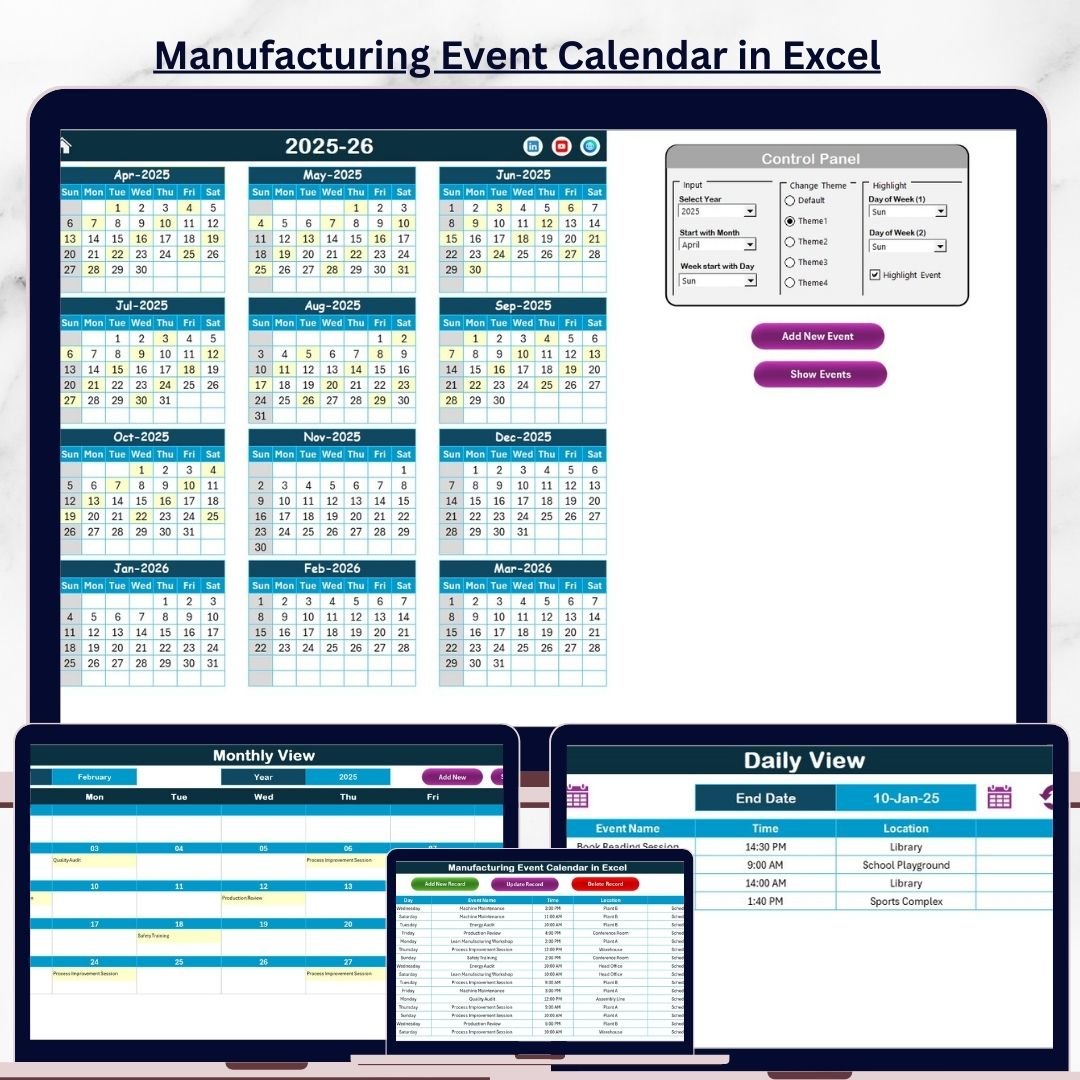 This ready-to-use Excel calendar provides a centralized, visual, and highly structured system to plan, track, and manage all manufacturing-related events in one professional workbook. Instead of juggling multiple files or reminders, your entire event schedule becomes clear, organized, and under control.