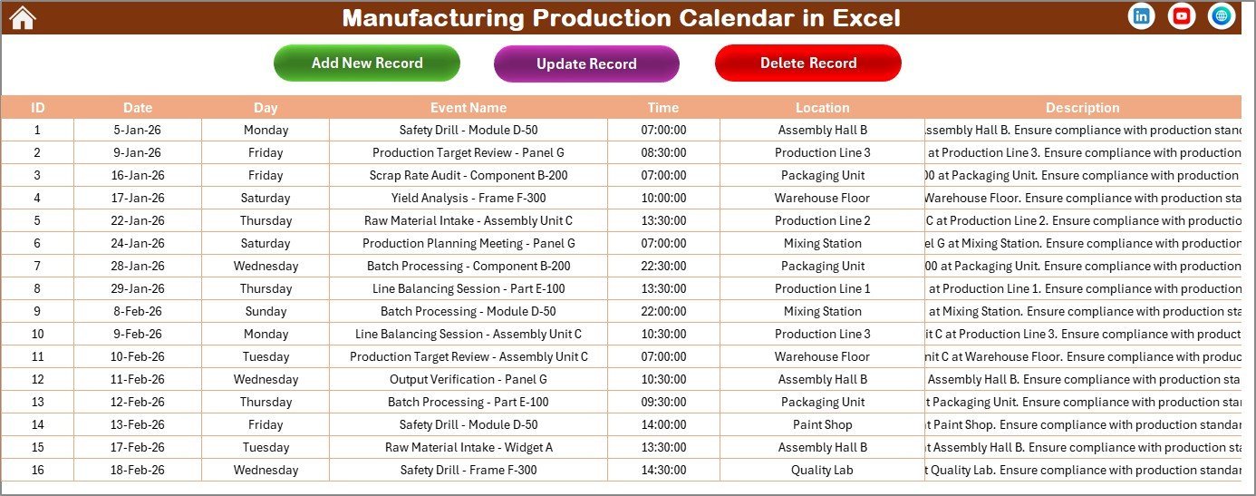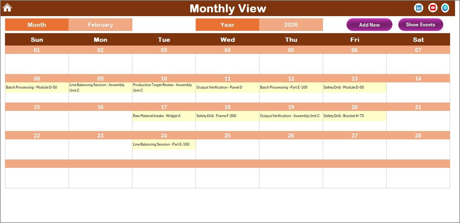 This Manufacturing Production Calendar in Excel combines flexibility, ease of use, and powerful functionality to help you stay organized, boost productivity, and never miss a critical production event.