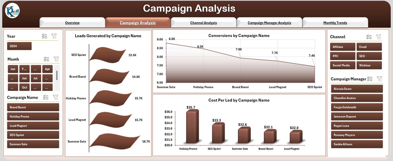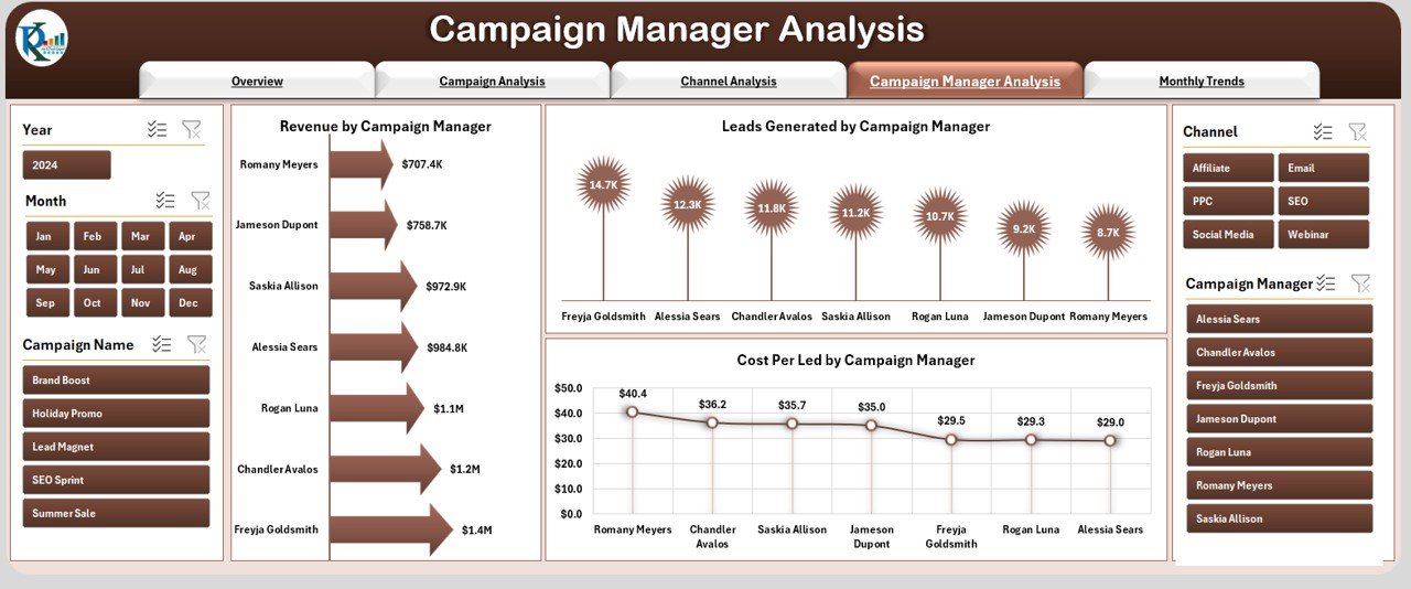 ✨ Five Analytical Pages – Overview, Campaign Analysis, Channel Analysis, Manager Analysis, and Monthly Trends.