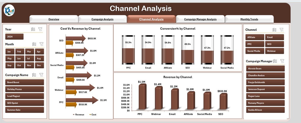 3️⃣ Channel Analysis Page – Compare channel efficiency across cost, revenue, and conversions.