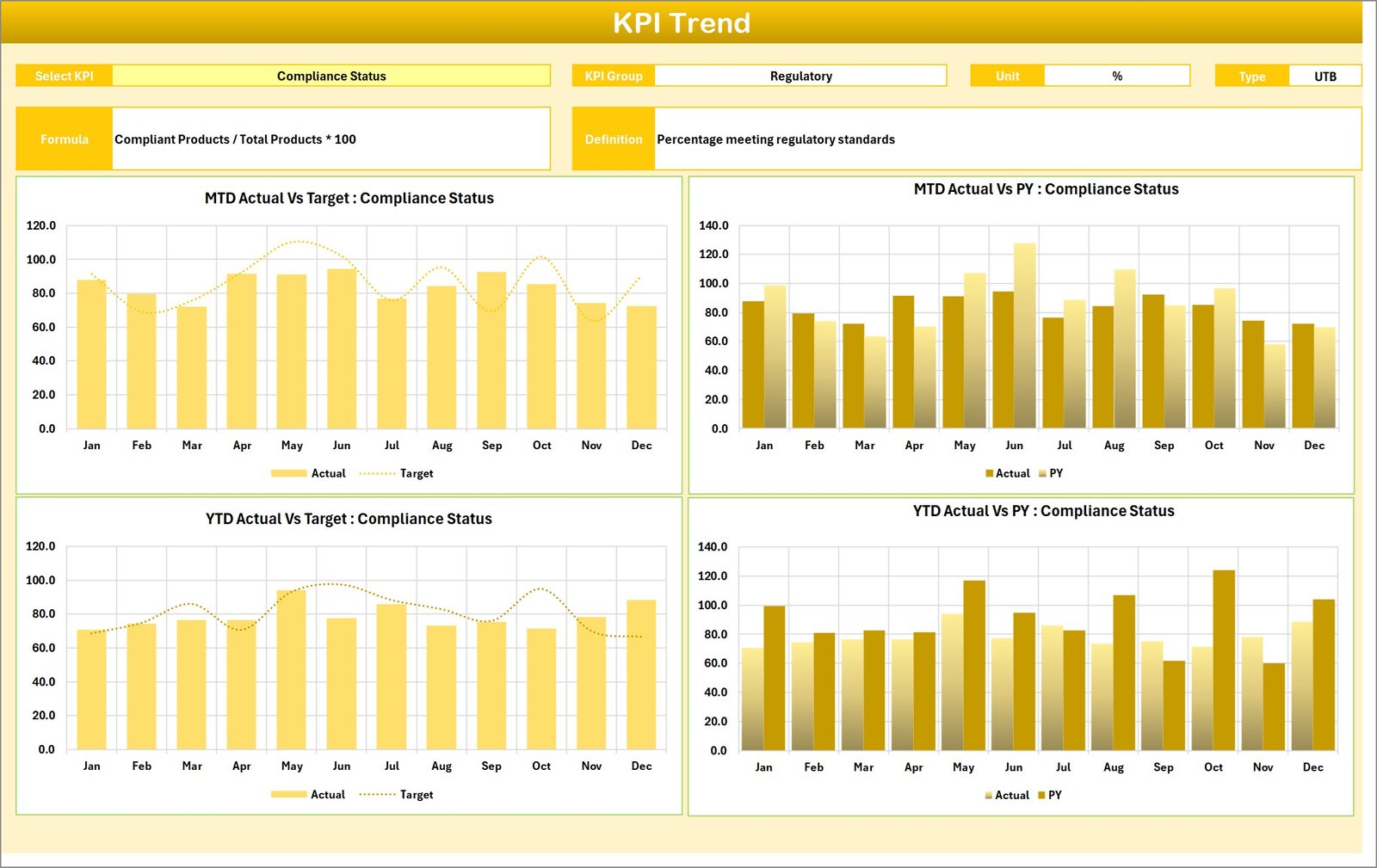 - 📈 KPI Trend Sheet: Analyze trends over time with selectable KPIs, detailed KPI groupings, units, formulas, and definitions, complemented by MTD and YTD trend charts.