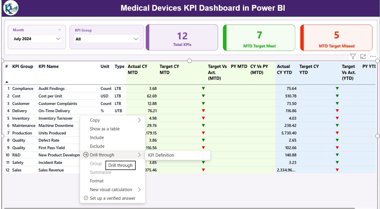 🔍 Drill-Through KPI Definitions – Right-click any KPI to view formula, type (LTB/UTB), and explanation.