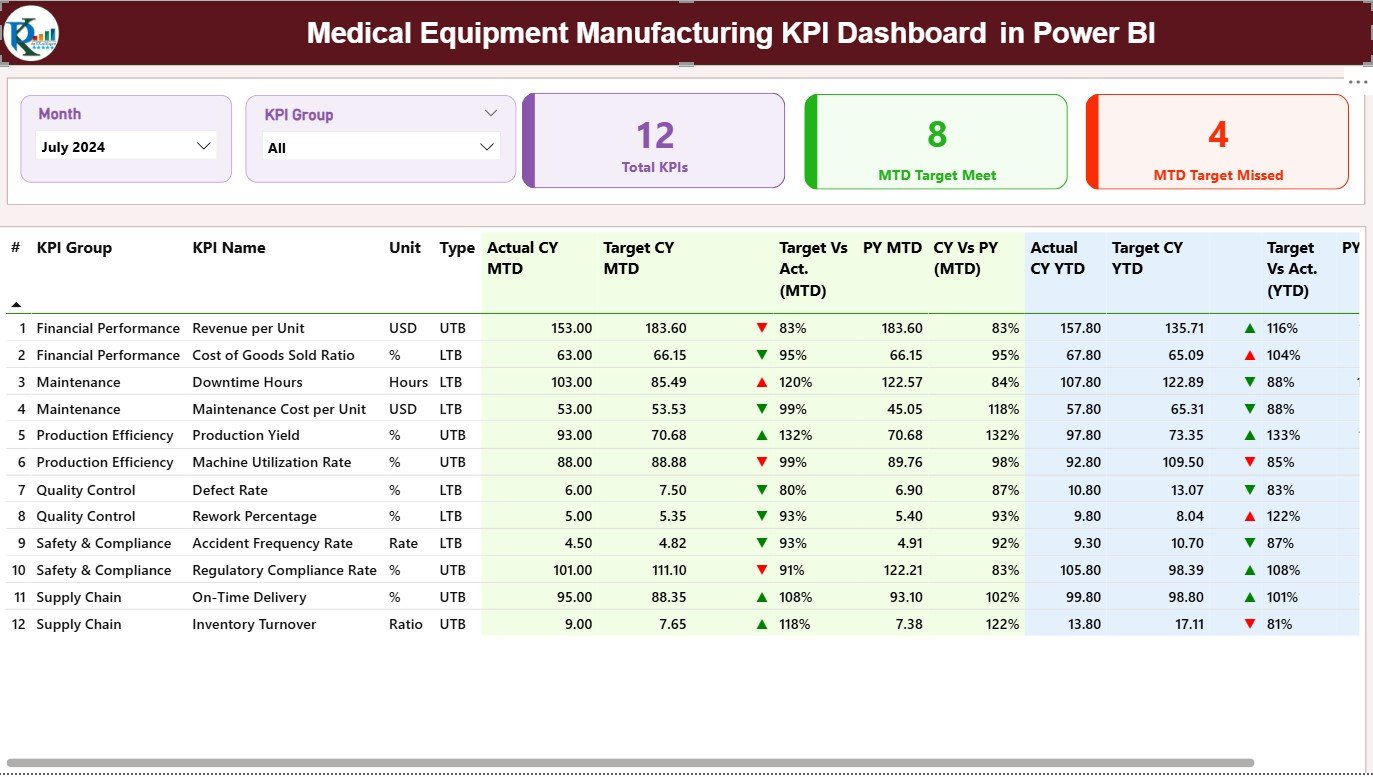 ⚙️ Key Features of the Medical Equipment Manufacturing KPI Dashboard in Power BI