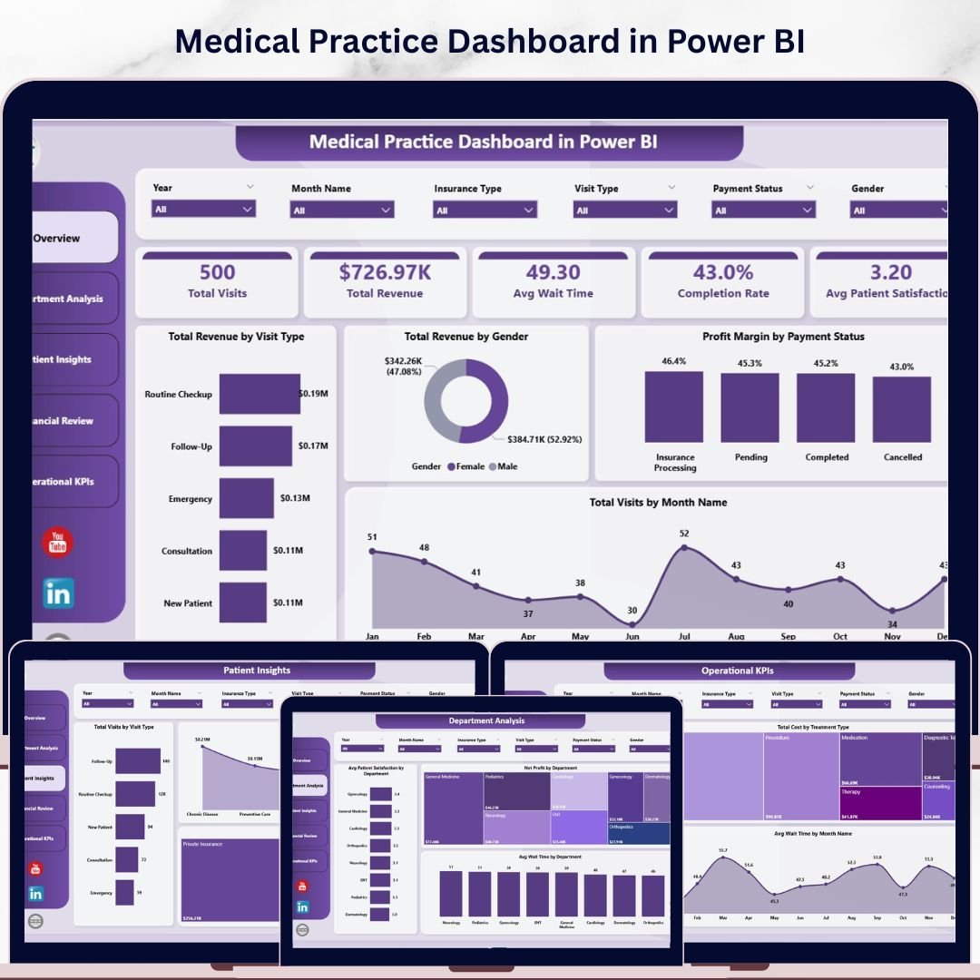 The Medical Practice Dashboard in Power BI is a professionally designed, ready-to-use analytics template built for clinics, hospitals, private practices, and healthcare administrators who need to track patient visits, revenue, departmental performance, and operational KPIs — all from a single Power BI file. This dashboard includes 5 interactive analysis pages covering an Overview, Department Analysis, Patient Insights, Financial Review, and Operational KPIs. It tracks key metrics including Total Visits, Total Revenue, Average Wait Time, Completion Rate, and Average Patient Satisfaction across multiple departments, visit types, insurance categories, and payment statuses.