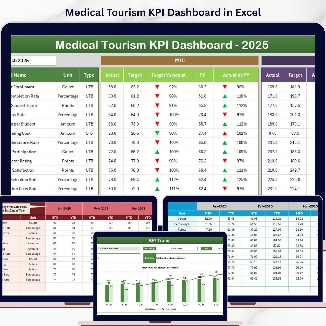 This digital product is a fully customizable Excel-based KPI dashboard designed specifically for the medical tourism industry. It includes: