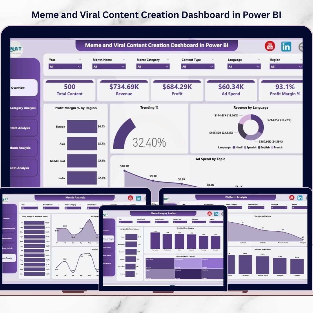 The Meme and Viral Content Creation Dashboard in Power BI helps marketers and creators analyze engagement, track revenue, and optimize viral campaigns.