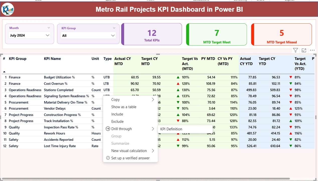 📉 Trend Analysis Charts – Understand performance direction using MTD and YTD trend charts.Metro Rail Projects KPI Dashboard in Power BI