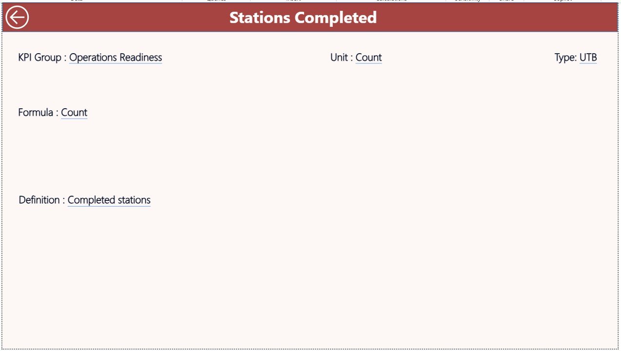 A drill-through reference page that displays KPI number, group, name, unit, formula, definition, and KPI type (LTB or UTB). This ensures clarity, standardization, and audit readiness.