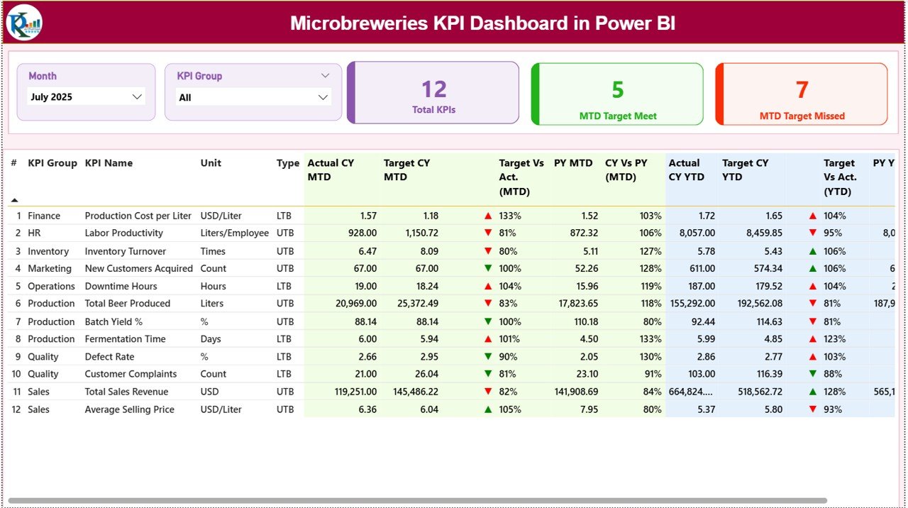 The Microbreweries KPI Dashboard in Power BI transforms structured Excel data into dynamic, interactive, and executive-ready performance visuals. Instead of manually comparing reports, you instantly monitor MTD, YTD, Target vs Actual, and Previous Year performance — all in one powerful dashboard.