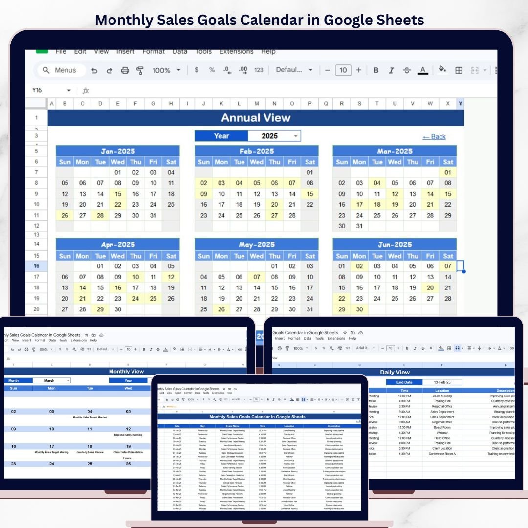 The Monthly Sales Goals Calendar in Google Sheets organizes sales targets, events, and deadlines across 5 interactive sheets with 4 navigation views — Annual, Monthly, Daily, and Events. Setup takes under 10 minutes: enter your sales events, goals, and meetings into the Events sheet, and every calendar view updates automatically.Monthly Sales Goals Calendar in Google Sheets