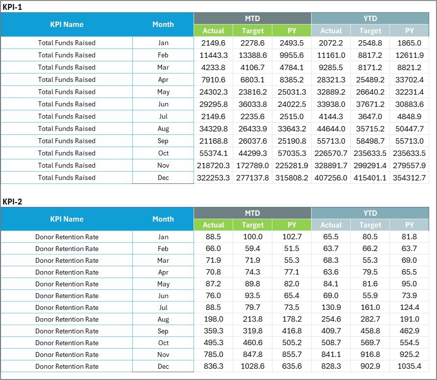 📋 Category-Based Tracking: Monitor KPIs across fundraising, volunteer engagement, program impact, and operations.