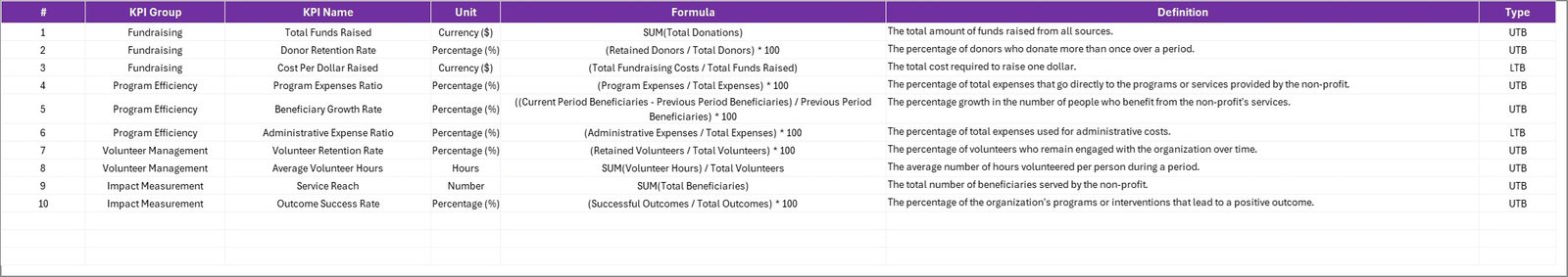 🧩 Comprehensive KPI Definition: Includes a reference sheet explaining each KPI’s name, group, unit, and formula.