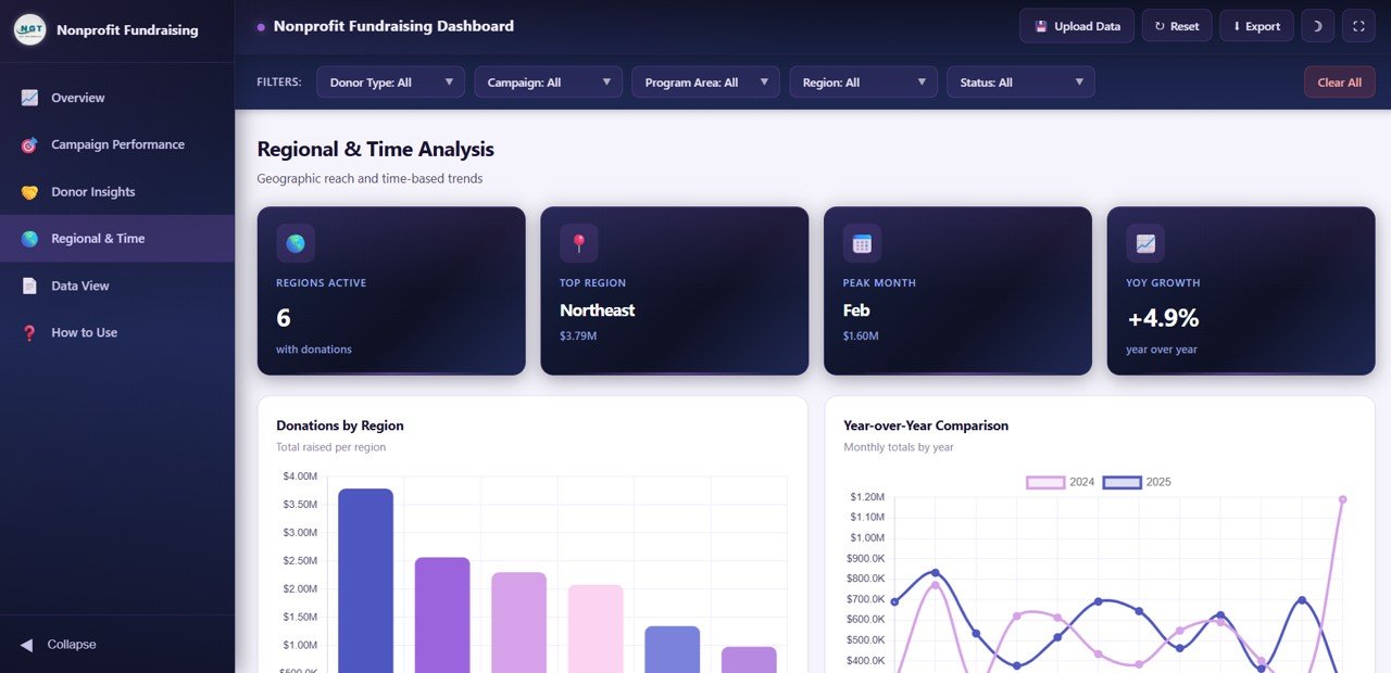 The Nonprofit Fundraising Dashboard in HTML by NextGenTemplates is one of the best options available. It includes 5 dedicated pages covering an Overview with 6 KPI cards, Campaign Performance, Donor Insights, Regional & Time Analysis, and a Data View with CSV export — all running in your browser with zero installation.