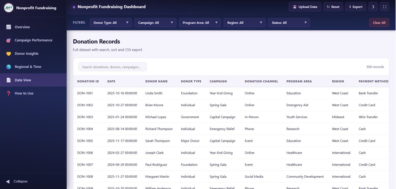The Data View page is a detailed data table that displays all donation records. This page features search functionality, column sorting, and pagination for navigating through large datasets efficiently. You can also export the filtered data to CSV format for use in external reports, grant applications, or further analysis in tools like Google Sheets or Excel.Nonprofit Fundraising Dashboard in HTML