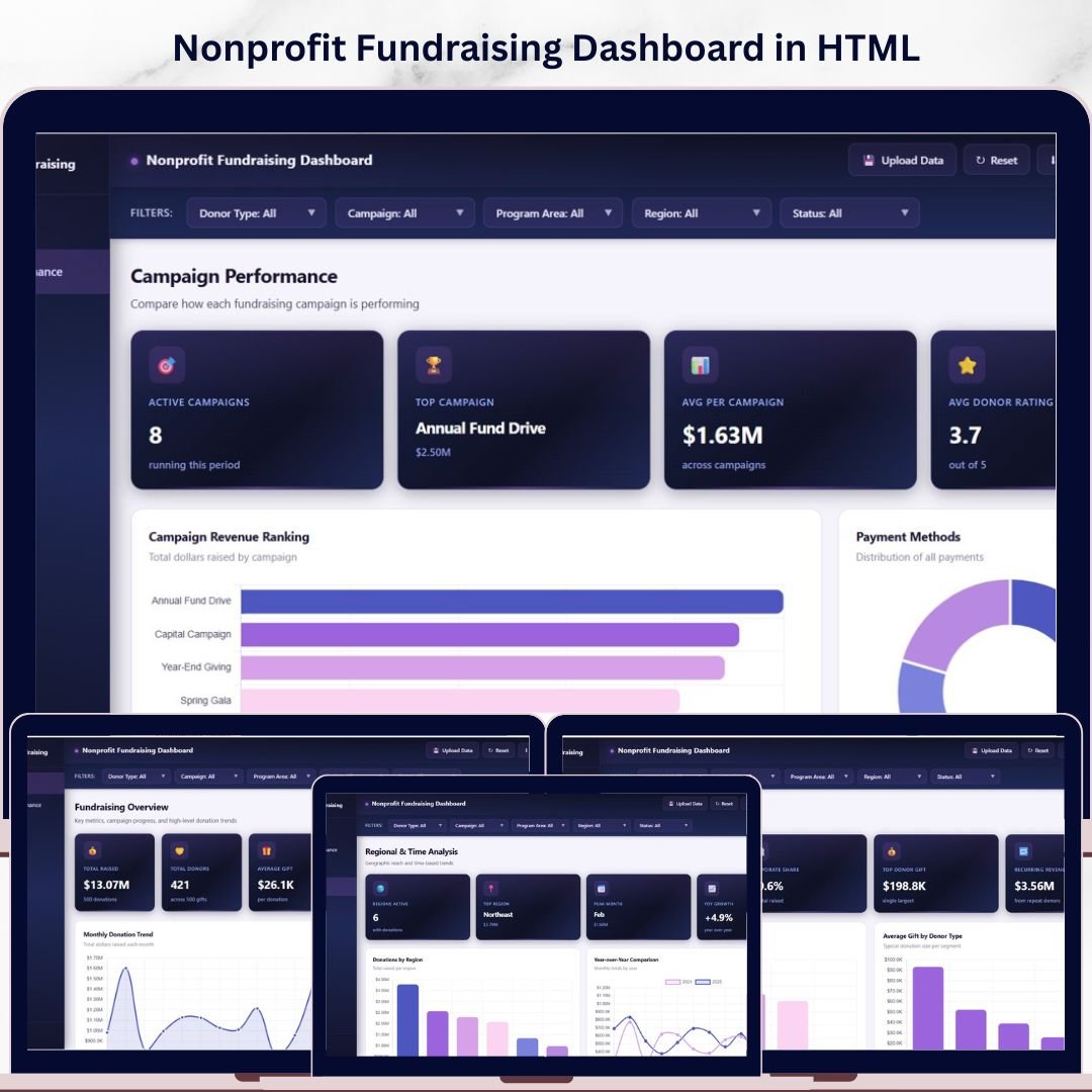 Nonprofit Fundraising Dashboard in HTML is a powerful, browser-based analytics solution designed for nonprofit managers, fundraising directors, development officers, grant coordinators, and charity analysts who need to monitor donation volumes, donor behavior, campaign effectiveness, and regional fundraising performance from a single interactive interface. This premium HTML dashboard template transforms raw fundraising data into meaningful visual insights that drive smarter, faster decisions across every level of your nonprofit organization.Nonprofit Fundraising Dashboard in HTML