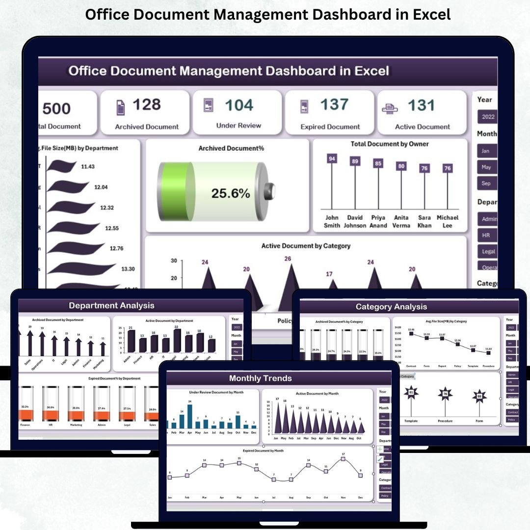 These features collectively transform how your team organizes, tracks, and manages documents every day.Office Document Management Dashboard in Excel