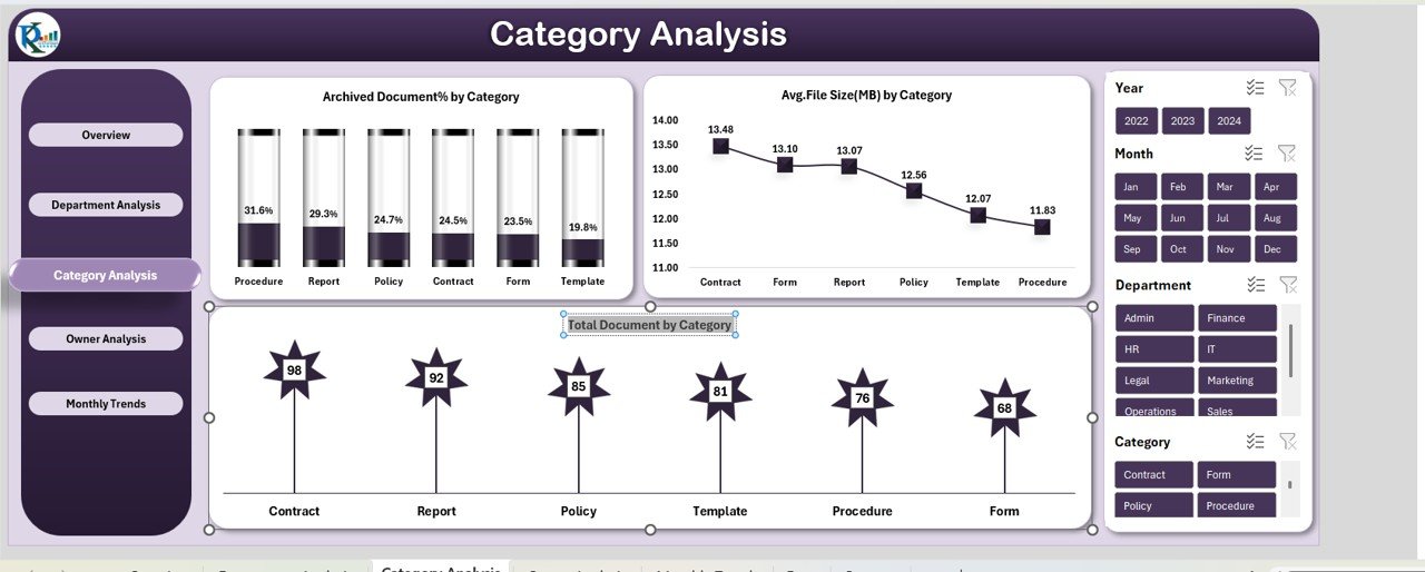 • 🔍 Deep-Dive Analytics Pages: Analyze documents through Overview, Department, Category, Owner, and Monthly Trends pages.