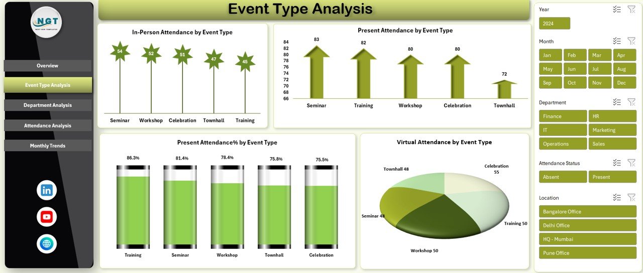 The Office Event Attendance Dashboard in Excel is a ready-to-use analytical Excel file designed to track, monitor, and analyze employee attendance across all types of office events from a single centralized dashboard. Instead of juggling emails, manual trackers, or scattered spreadsheets, this dashboard converts raw attendance data into clear visual insights that decision-makers can understand instantly.
