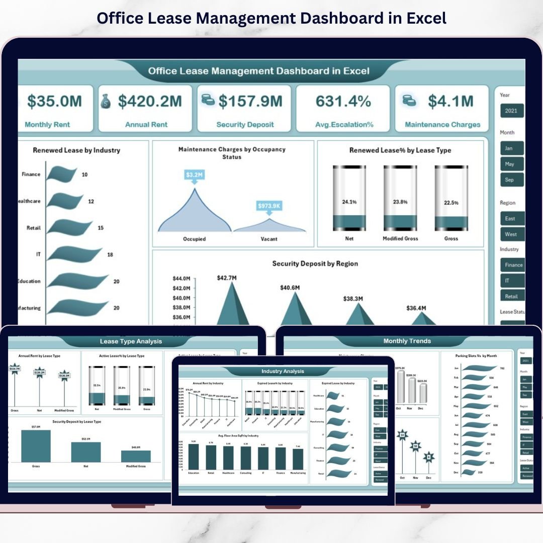 🎯 Dynamic Slicers & Filters – Filter by Industry, Region, Lease Type, and Month instantly.