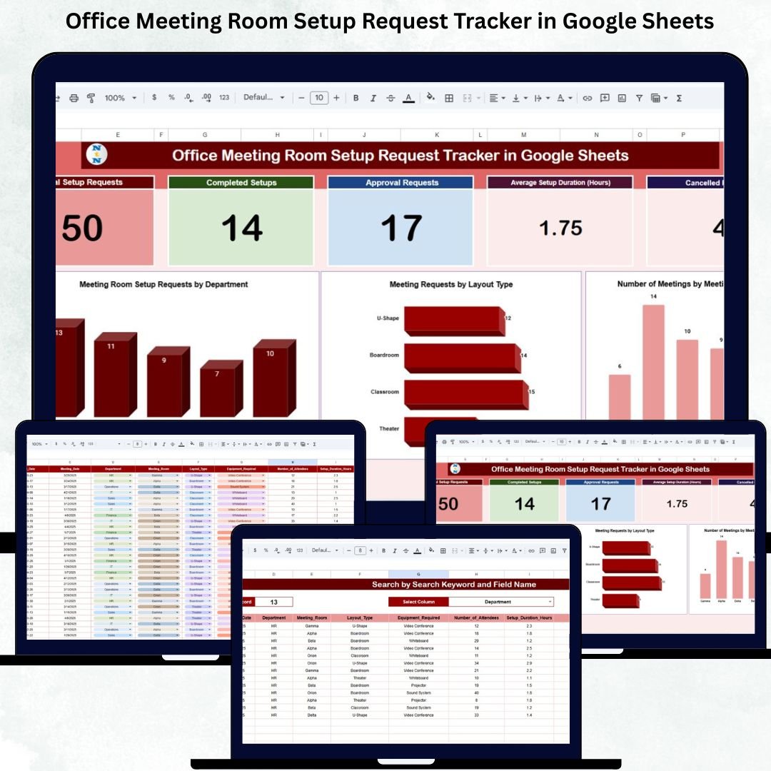 The Office Meeting Room Setup Request Tracker in Google Sheets transforms messy, unstructured meeting room management into a clean, transparent, and automated workflow. With smart KPIs, visual dashboards, and powerful search features, office teams ensure every meeting is set up correctly and on time.