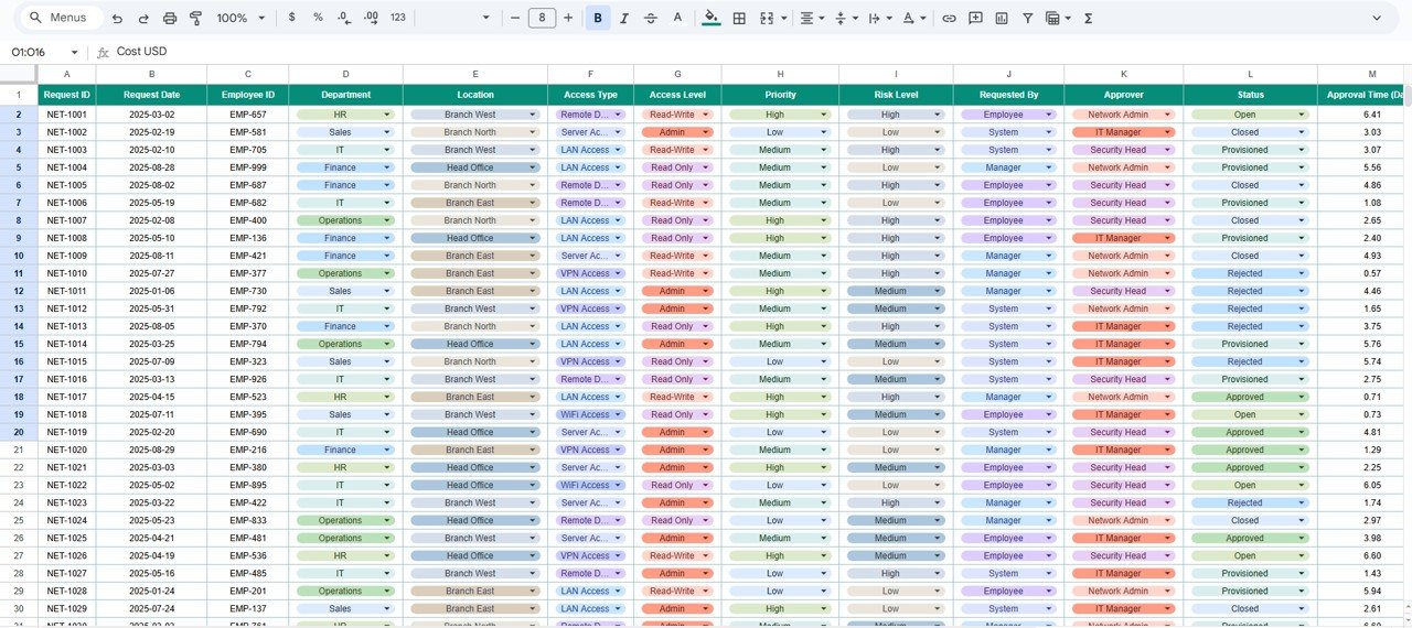 This ready-to-use tracker provides a centralized, transparent, and structured system to manage all network access requests efficiently. It helps IT teams log access requests, track approvals, analyze risk levels, monitor provisioning timelines, control access levels, and track access-related costs from one single Google Sheets file.