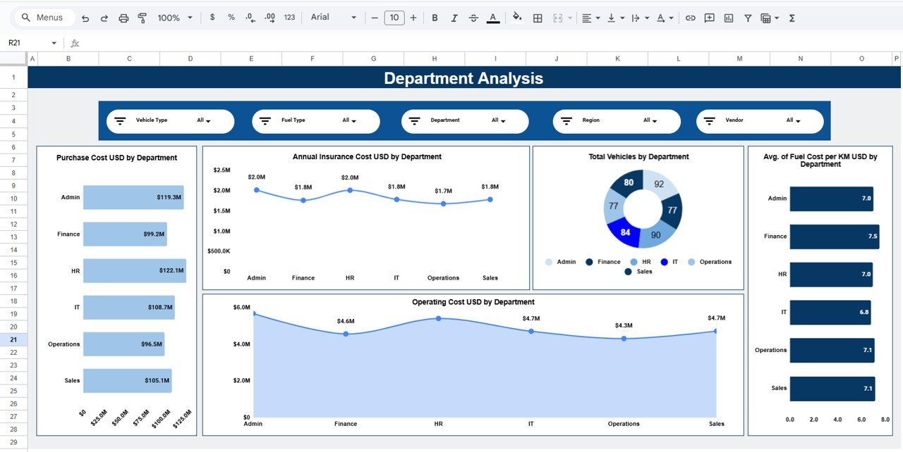 This dashboard converts raw fleet data into clear KPIs, interactive visuals, and actionable insights using Google Sheets. Instead of manually compiling reports, organizations can instantly track fleet costs, usage patterns, and performance from a single centralized dashboard. Because it is built in Google Sheets, it is cloud-based, collaborative, cost-effective, and easy to customize—without the need for complex BI tools or technical expertise.
