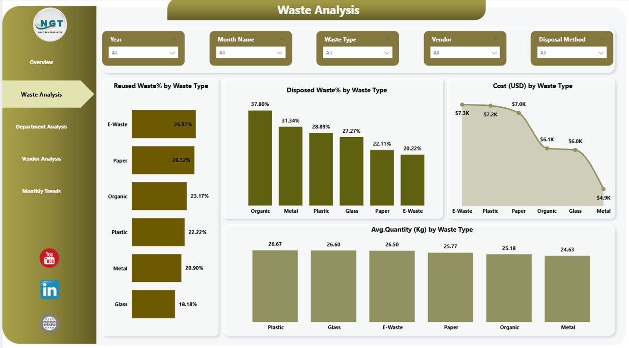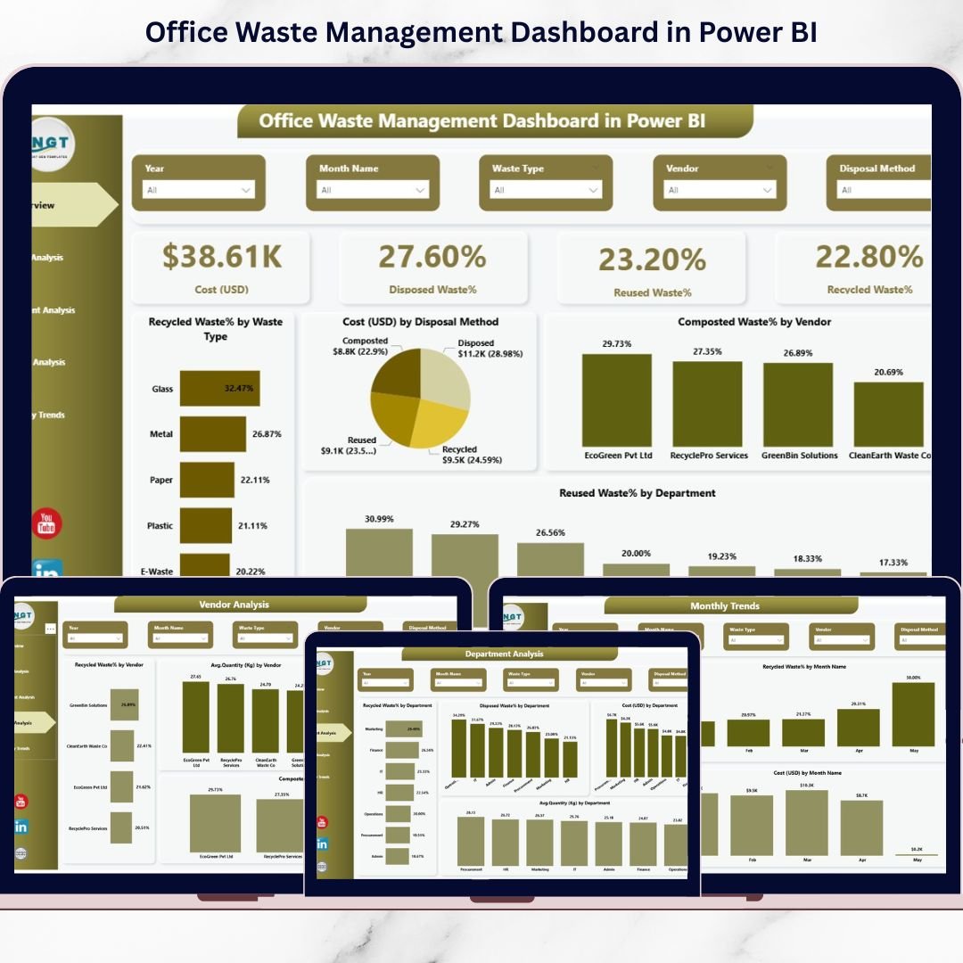 The Office Waste Management Dashboard in Power BI is a ready-to-use, interactive business intelligence solution designed to help organizations monitor waste performance, control disposal costs, and improve sustainability metrics — all in one place.