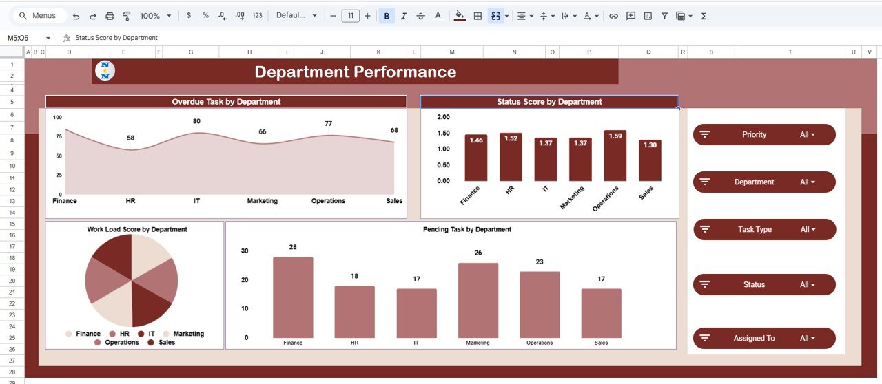 Track Overdue Tasks, Pending Tasks, and Status Scores by department.