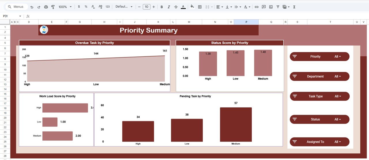Overdue Tasks by Priority and Status Scores by Priority reveal how high-importance work is managed.