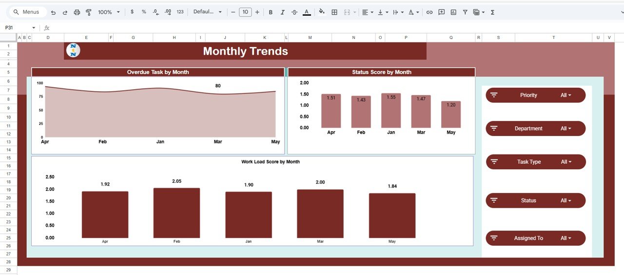Overdue Tasks by Month, Status Score by Month, and Workload Score by Month charts show how performance evolves.